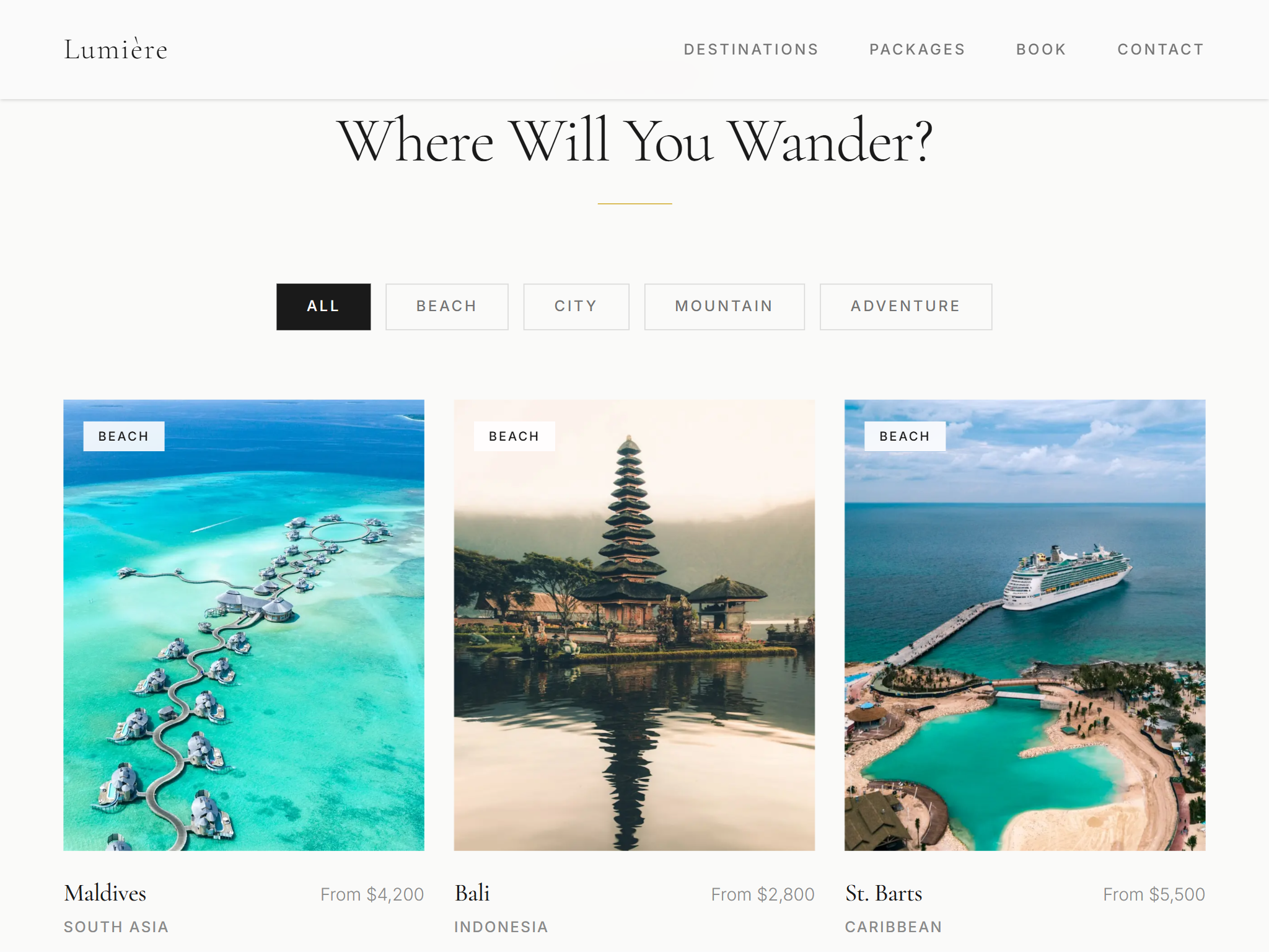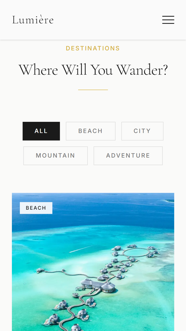 Lumière Travel is a bespoke booking platform designed for a boutique travel agency specializing in luxury, personalized experiences. The platform allows users to create dynamic itineraries, and check real-time availability across multiple suppliers.
